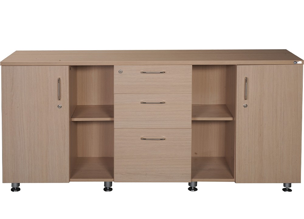 Tủ tài liệu thấp có hai khoang cánh mở hai bên. Khoang giữa có 3 ngăn kéo.