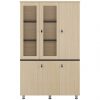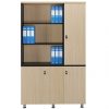 Tủ tài liệu 3 buồng gỗ Melamine, phía trên có 3 cánh kính và đợt di động, phía dưới có 2 khoang cánh mở và 3 ngăn kéo để đồ. Sử dụng tay nắm vát cạnh và có khóa.