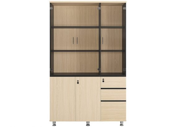Tủ tài liệu 3 buồng gỗ Melamine, phía trên có 3 cánh kính và đợt di động, phía dưới có 2 khoang cánh mở và 3 ngăn kéo để đồ. Sử dụng tay nắm vát cạnh và có khóa.