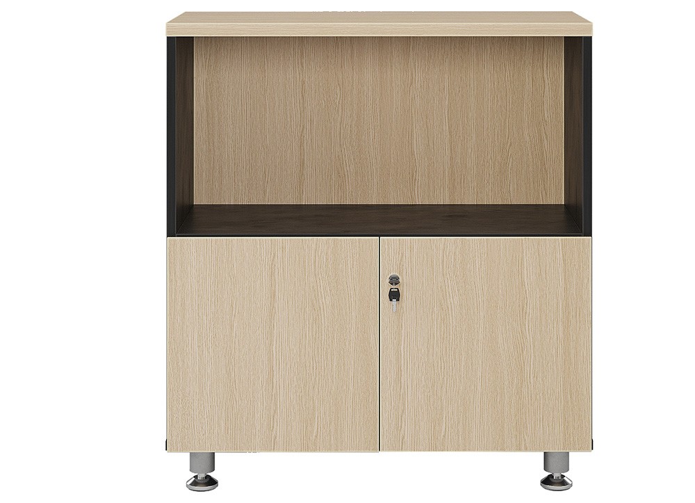 Tủ tài liệu thấp gỗ melamine có 2 khoang để file, khoang dưới gồm 2 cánh mở và có khóa. Tủ sử dụng tay nắm vát cạnh và có khóa.